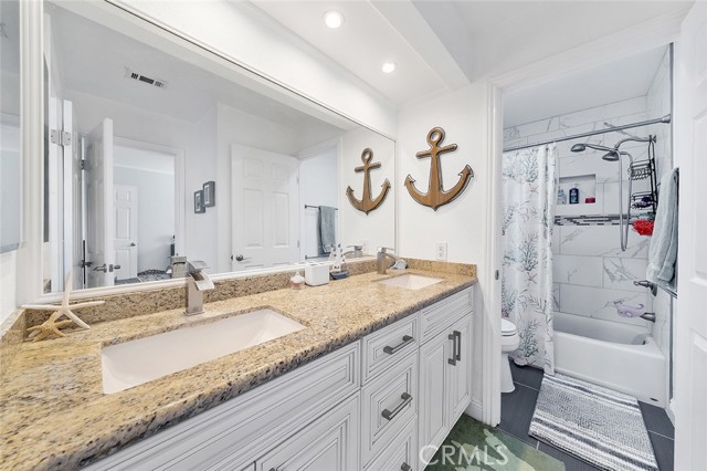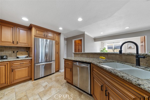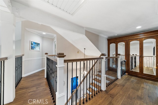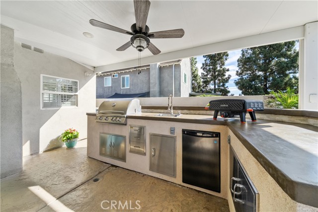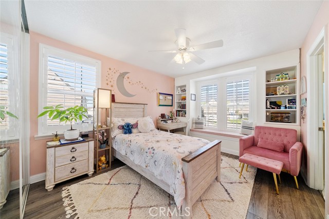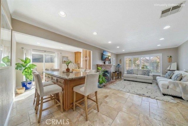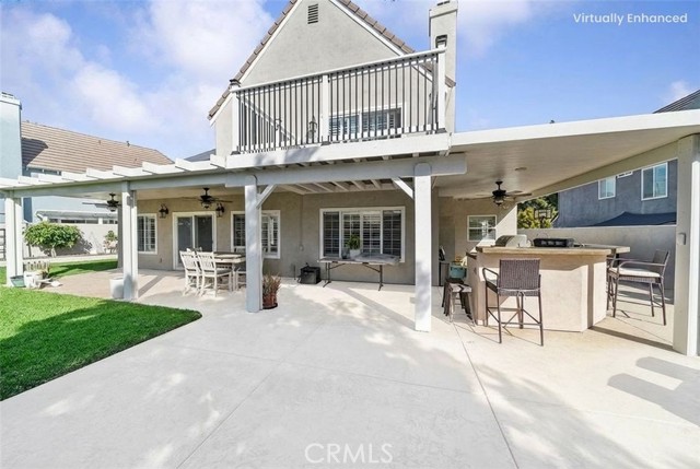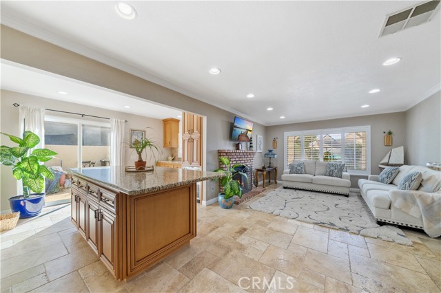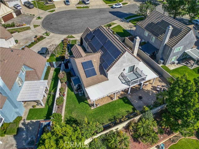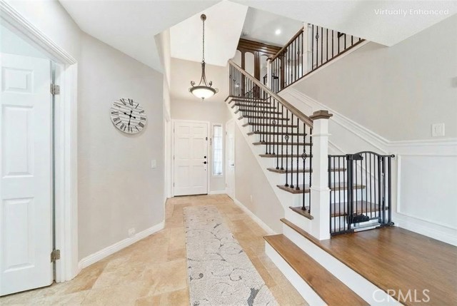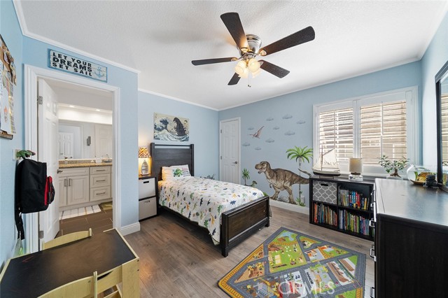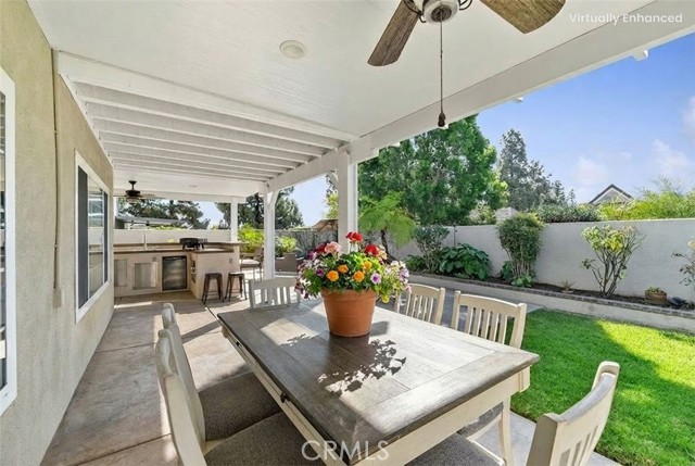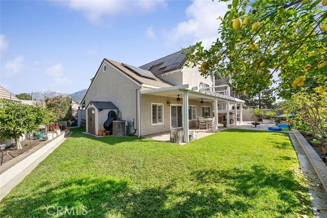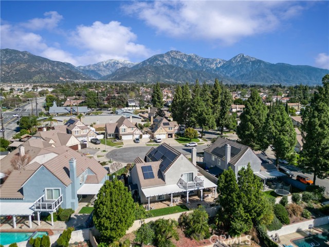 Charming Storybook Home in the Upland Foothills set in a Quiet Cul-de-Sac Location. Beautifully maintained and thoughtfully upgraded, this stunning home sits on an expansive 9,500+ sq ft lot in a desirable Upland foothill neighborhood. Exceptional curb appeal and lush landscaping welcome you into a bright, open floor plan with cathedral ceilings, freshly painted interiors, and abundant natural light. The main level features a downstairs bedroom and full bathroom, a spacious living room with exposed ceiling beam, formal dining room, and dry bar. The remodeled kitchen offers granite countertops, under-cabinet lighting, self-closing cabinets, a large pantry with pull-out drawers, and an extended island ideal for dining and entertaining. Built-in cabinetry with wine refrigerator complements the adjacent family room with brick fireplace and plantation shutters. A new custom wood staircase with decorative paneling leads upstairs to four spacious bedrooms, including one with a large attached closet/playroom. The fully remodeled upstairs bathrooms feature elegant tile flooring and granite countertops, including a Jack-and-Jill bathroom. Several bedrooms include oversized closets with custom built-in shoe racks. The primary bedroom opens to a private walk-on patio with scenic views. Flooring includes travertine and plush carpet downstairs, wood flooring upstairs, and laminate flooring in select bedrooms. The outdoor space is a true retreat with meticulously landscaped front and back yards. Features include a newly redone primary bedroom balcony with Trex decking and solar lighting, R.V. parking, stamped concrete, and a custom outdoor kitchen with 5-burner BBQ, sink, refrigerator, and storage. Additional highlights include insulated patio covers with remote-controlled fans, a fire pit, tranquil pond with two waterfalls, mature fruit trees (lemon, apple, avocado, orange), and a separate dog kennel area, large exterior shed, BRAND NEW AC SYSTEM, window seats with storage, shutters throughout, large walk-in closets, and solar panels. An exceptional blend of comfort, style, and outdoor living—this home is a must-see.