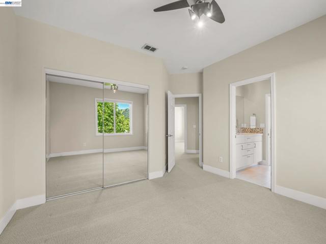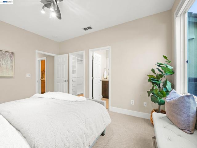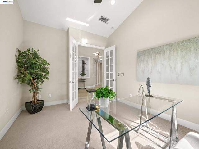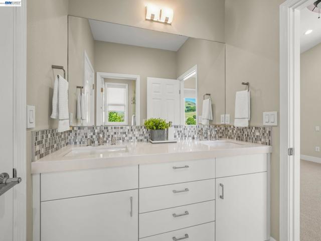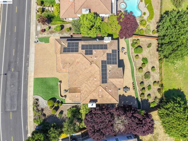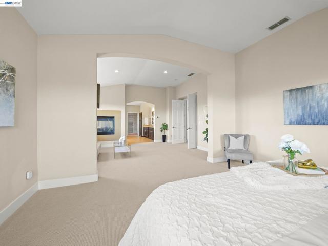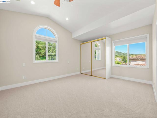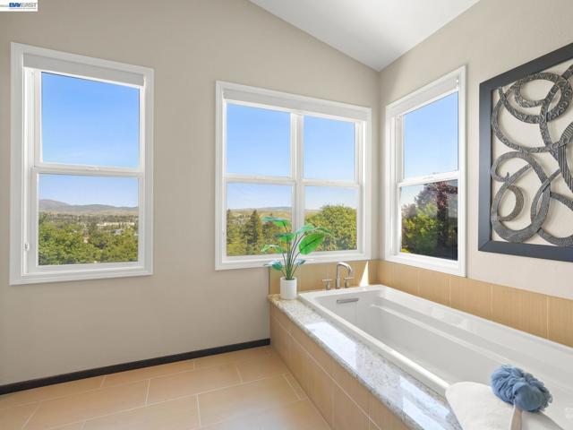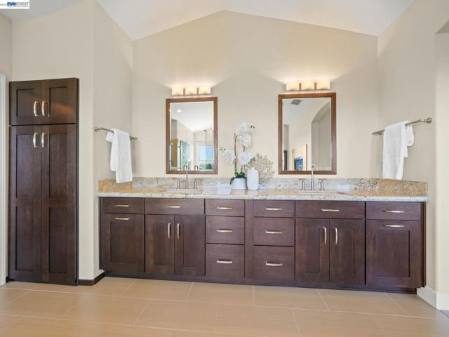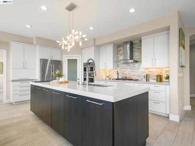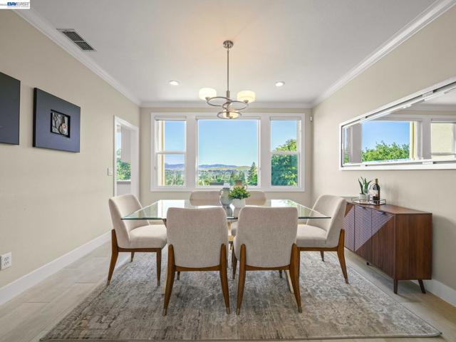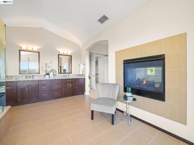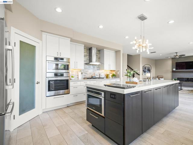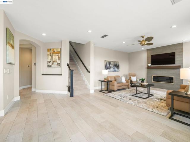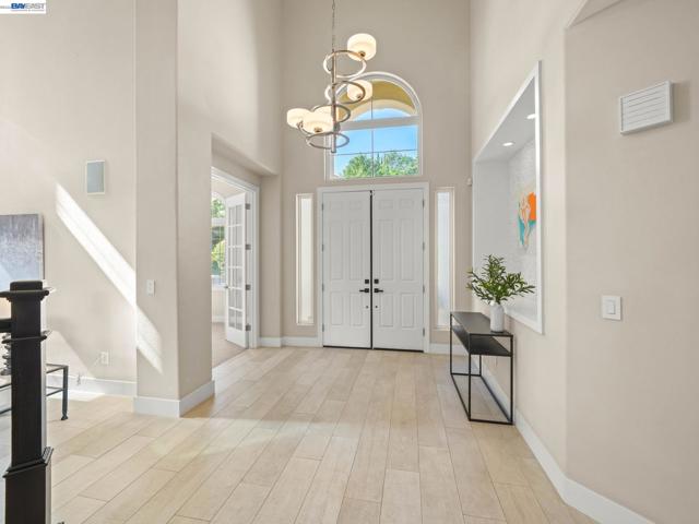 Fully upgraded and impeccably designed, this exceptional Westside San Ramon residence offers 5 bedrooms, 4 baths, plus a private office—blending refined luxury with everyday livability. A dramatic double-height entry with sweeping front staircase and secondary rear staircase creates a grand first impression, while expansive windows frame scenic views and fill the home with natural light. At the heart of the home, the chef’s kitchen is thoughtfully curated with premium Bosch appliances, a Fisher & Paykel gas cooktop, quartz countertops, an oversized island, striking two-toned cabinetry, full tile backsplash, and a generous walk-in pantry—perfect for both daily living and elevated entertaining. Elegant living spaces are enhanced by electric fireplaces, crown molding, architectural detailing, and radiant heated tile flooring in select areas. The expansive primary suite offers a true retreat with Mt. Diablo views, a two-sided fireplace, private sitting area, and a custom-designed walk-in closet. The spa-inspired bath features dual showerheads and refined finishes for a resort-like experience. Spacious secondary bedrooms include built-ins and ceiling fans for comfort and functionality. Enjoy a rare sense of privacy with no front or rear neighbors, complemented by beautifully designed outdoor spaces with brick paver hardscape. Additional highlights include a 3-car side-by-side garage with epoxy flooring, ample storage, leased solar, and EV charging—delivering a seamless blend of luxury, efficiency, and modern living.
