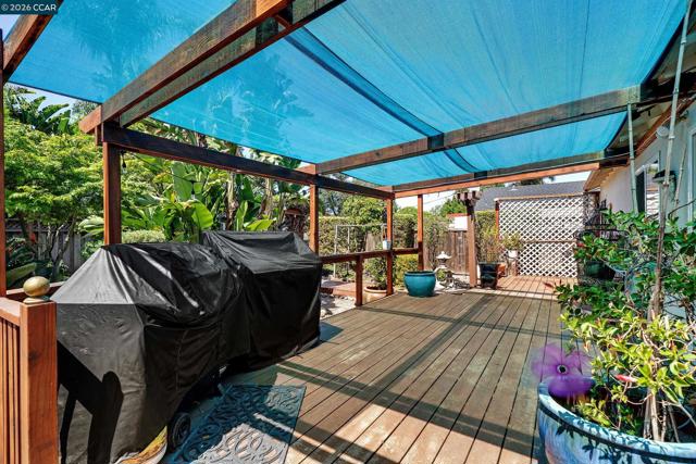 Charming 3-bedroom home nestled in the desirable San Lorenzo Village neighborhood. This inviting residence features a cheerful, modern kitchen complete with a gas stove, crisp gray cabinetry, and a charming greenhouse window that fills the space with natural light. Recessed lighting and beautiful hardwood flooring enhance the home’s warm and contemporary feel. Enjoy professionally landscaped front and back yards designed for both relaxation and entertaining, including a spacious deck surrounded by lush greenery and specialty flowers, creating a private, serene setting perfect for gatherings, barbecues, or simply enjoying the natural surroundings. The garden is ready for your own organic fruits and vegetables, offering a wonderful opportunity for farm-to-table living right at home. A versatile bonus structure provides additional space ideal for a storage room, studio, fitness area, or creative retreat, offering a variety of functional possibilities. Great location for commuters with easy access to transportation and major highways, including 880, 238, and 580.