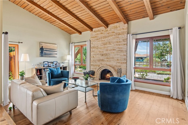 A gated courtyard entry sets the tone for this charming single-level home. The spacious living room features hardwood floors, a stone fireplace, and open-beamed vaulted ceilings, flowing naturally to the formal dining room. The remodeled kitchen is thoughtfully positioned at the heart of the home, complete with a center island and stainless steel appliances, it opens to the adjacent family room with expansive picture windows overlooking the grassy backyard. A cozy sunroom provides a quiet retreat, perfect as a reading nook or private hideaway. Additional highlights include a large driveway and a three-car garage. Ideally situated in the desirable Pt. Vicente neighborhood, just minutes from top-rated schools, shopping, and Terranea Resort, this home offers a compelling blend of single-level living, relaxed style, and comfort in one of Rancho Palos Verdes’ most sought-after neighborhoods.