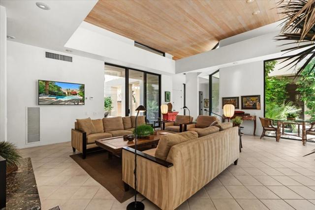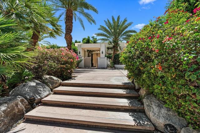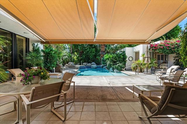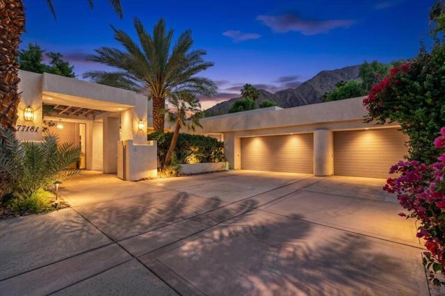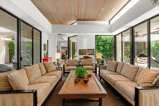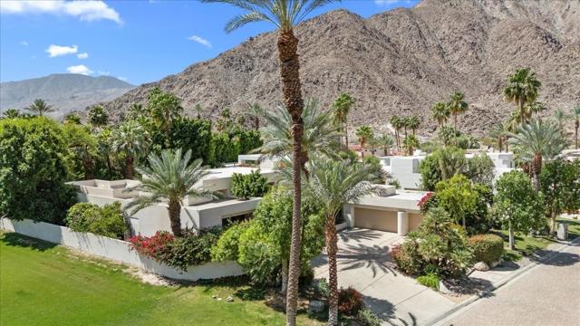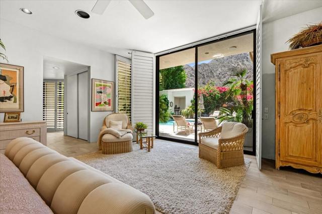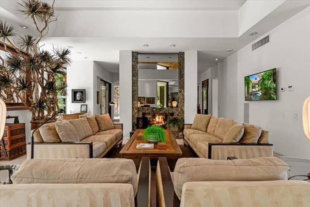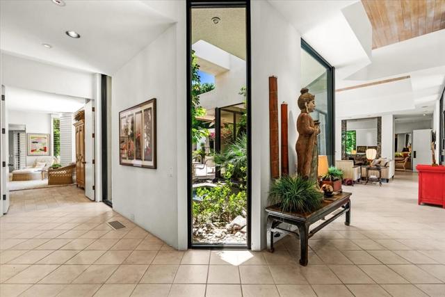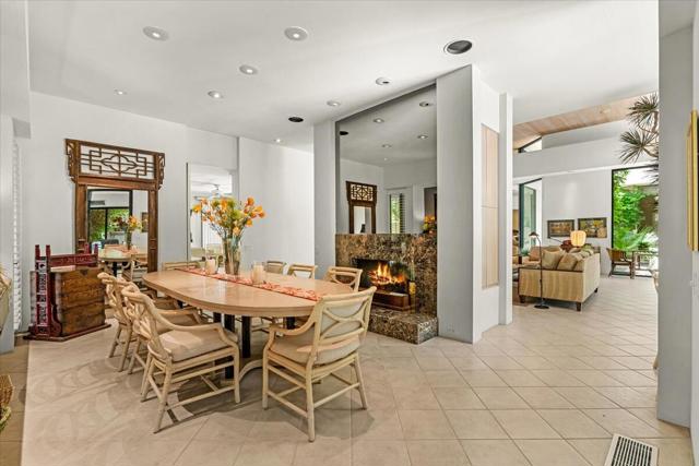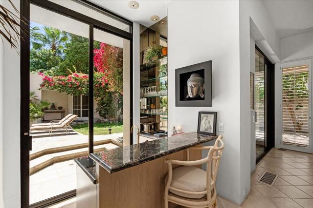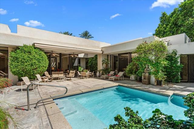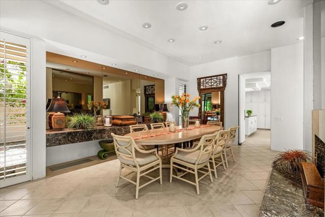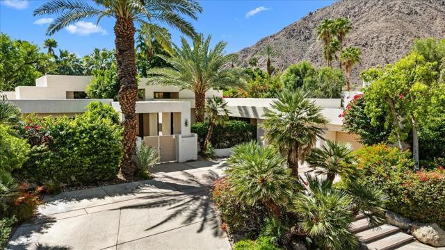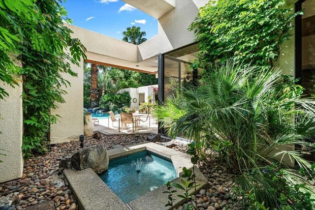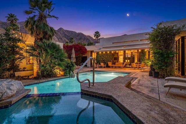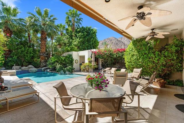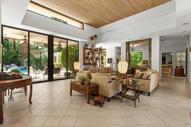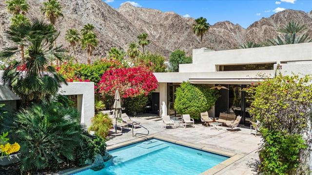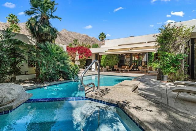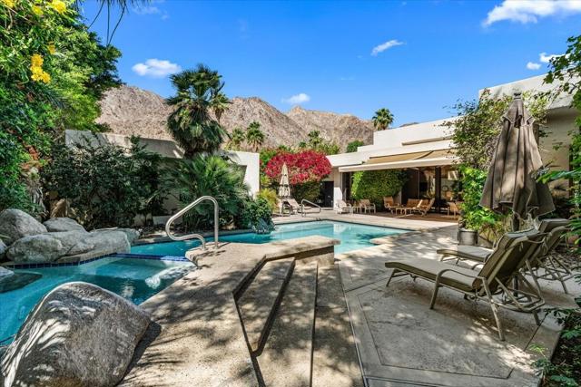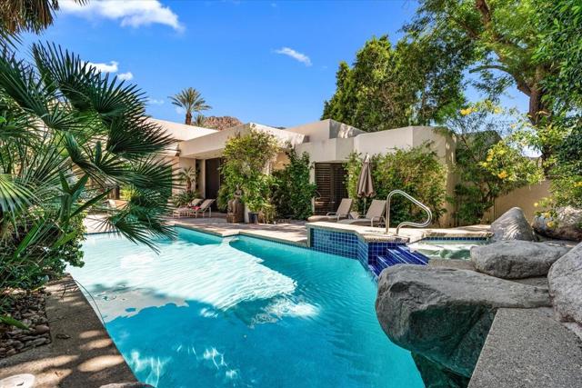 You will be enchanted by the layered luxury of this Balinese-colonial inspired villa! Lush foliage envelops this property, offering a sequestered, spa-like serenity. Multiple windows and walls of glass tempt you with glimpses of trees, plants, and sparkling pools. The vast great room features warm wood ceilings, recessed lighting, and a wet bar, hinting at gatherings yet to come. A massive marble fireplace anchors the room, and opens into the dining room as well. The island kitchen serves up sleek countertops, ample storage, a desk area, and a breakfast nook overlooking a private outdoor dining area.The carefully-curated decor continues into the guest suite, with tropical-toned fabrics and rich wood accents. The primary suite occupies one wing of the home, with multiple closets, poolside access, and mountain views. A private retreat, currently used as an exercise area, could be an office, a nursery, or an additional walk-in closet. The spacious patio area is designed for easy entertaining. With electric awnings, a recently-renovated pool and spa, and walls of palms and plantings, this is destined to become your favorite ''room'' in the house. A poolside casita is the ideal guest accommodation, reminiscent of an island sanctuary. Your desert dream awaits!