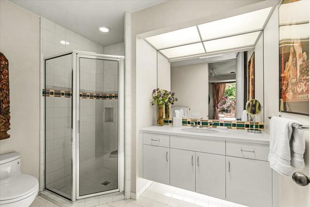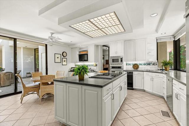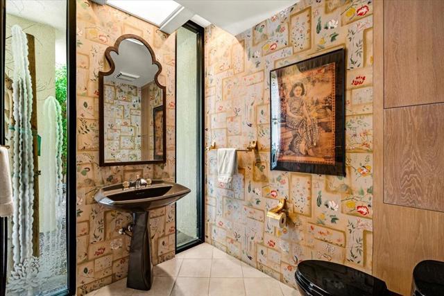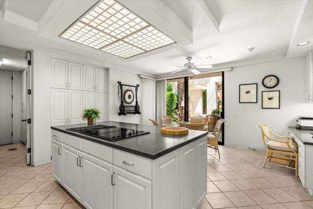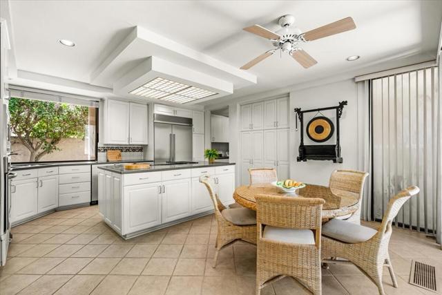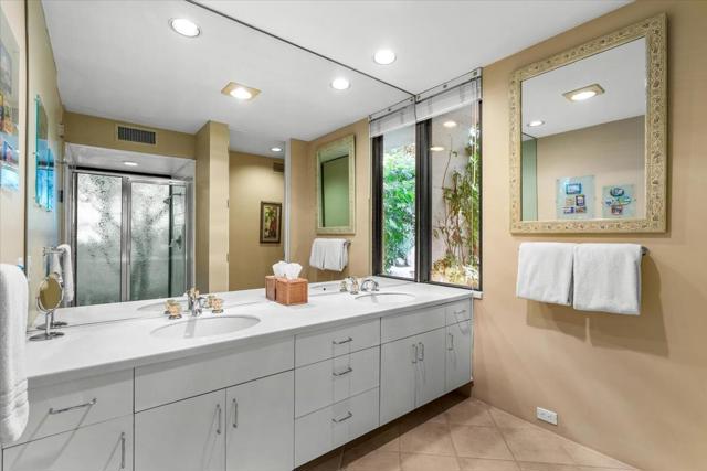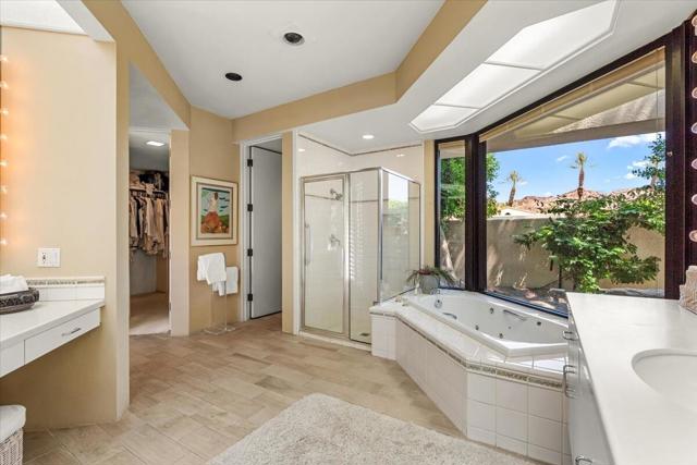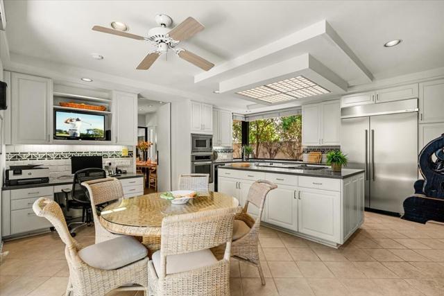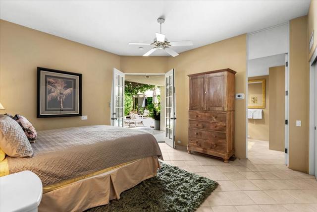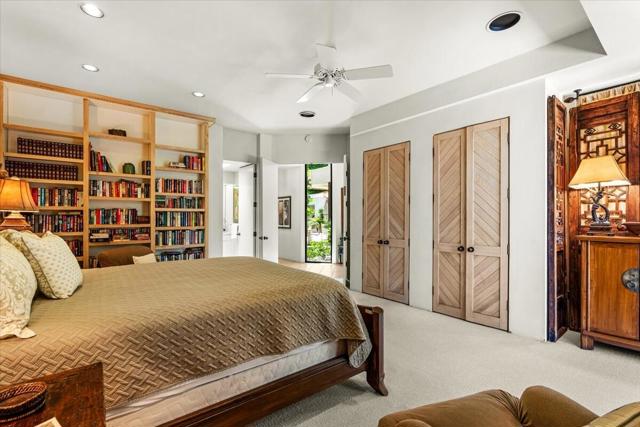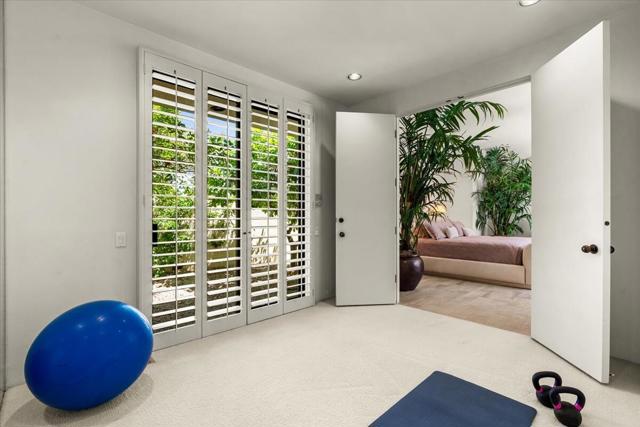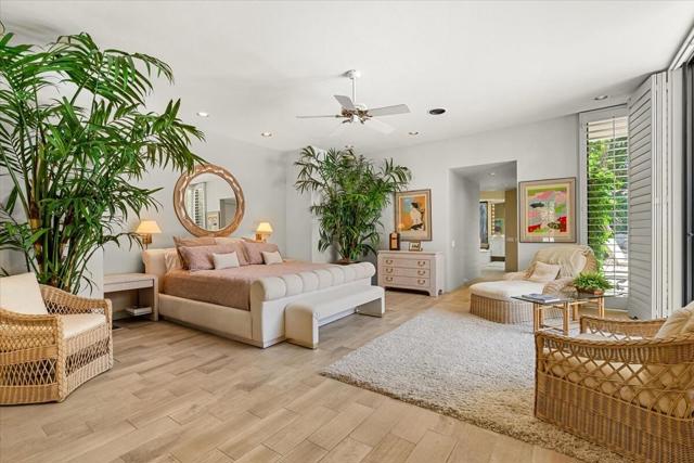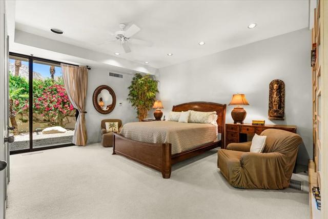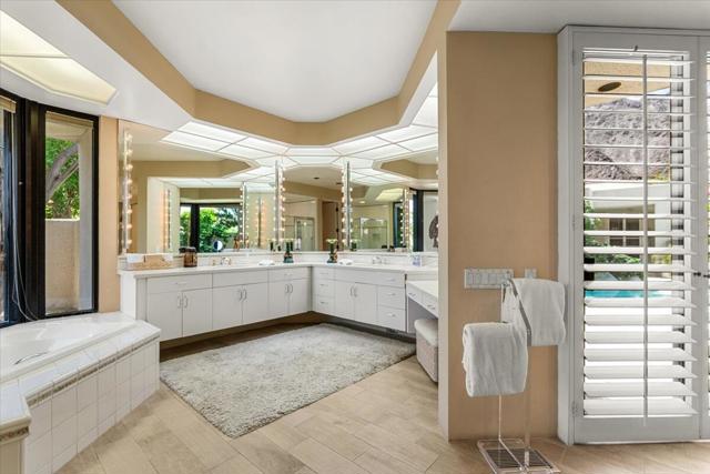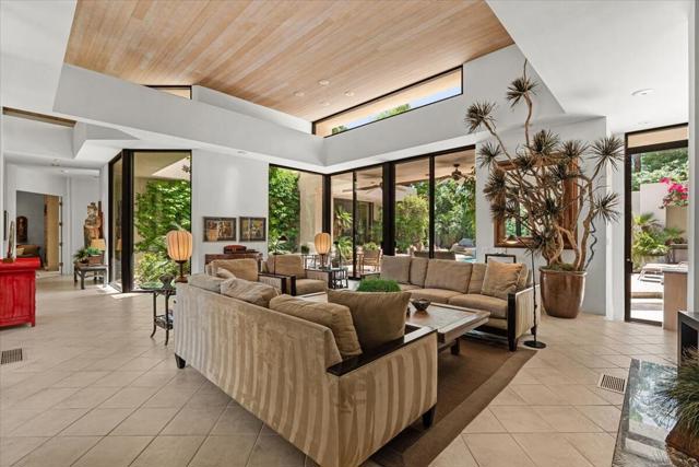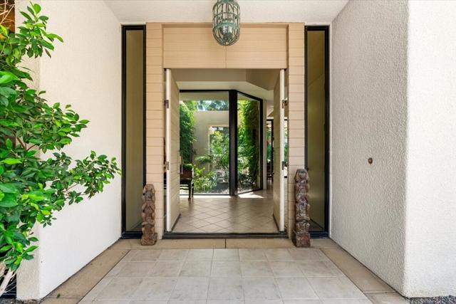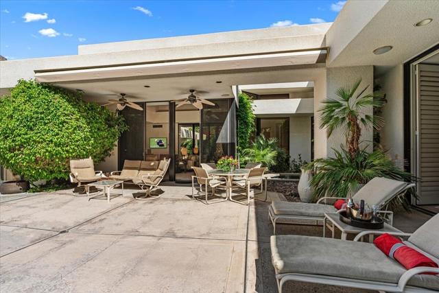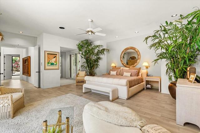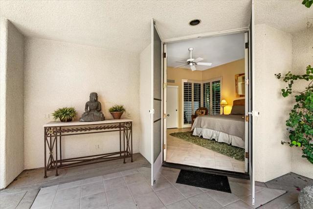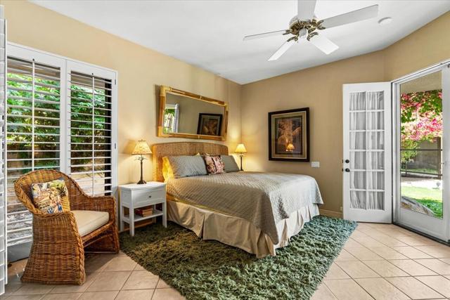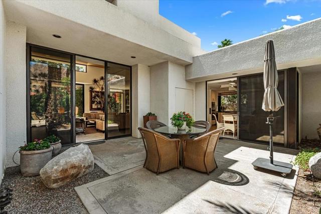 You will be enchanted by the layered luxury of this Balinese-colonial inspired villa! Lush foliage envelops this property, offering a sequestered, spa-like serenity. Multiple windows and walls of glass tempt you with glimpses of trees, plants, and sparkling pools. The vast great room features warm wood ceilings, recessed lighting, and a wet bar, hinting at gatherings yet to come. A massive marble fireplace anchors the room, and opens into the dining room as well. The island kitchen serves up sleek countertops, ample storage, a desk area, and a breakfast nook overlooking a private outdoor dining area.The carefully-curated decor continues into the guest suite, with tropical-toned fabrics and rich wood accents. The primary suite occupies one wing of the home, with multiple closets, poolside access, and mountain views. A private retreat, currently used as an exercise area, could be an office, a nursery, or an additional walk-in closet. The spacious patio area is designed for easy entertaining. With electric awnings, a recently-renovated pool and spa, and walls of palms and plantings, this is destined to become your favorite ''room'' in the house. A poolside casita is the ideal guest accommodation, reminiscent of an island sanctuary. Your desert dream awaits!