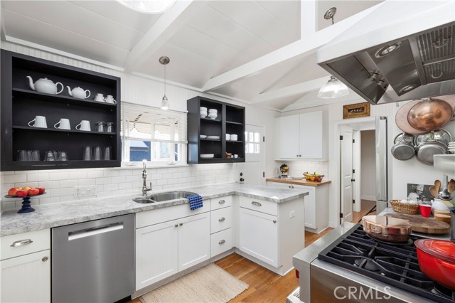 This delightful home is located on a large lot with ocean views and a secluded backyard. The entry welcomes one via a landscaped pathway past an ocean view patio with inviting seating to enjoy the views. The kitchen is equipped with newer Bosch and Wolf appliances, Kohler faucets, and hardware set off by Brazilian granite countertops. This home also features upgraded plumbing with a continuous hot water system. Whether enjoying the front yard ocean view or relaxing in the secluded rear yard, this home is the perfect example of Woods Cove tranquility.