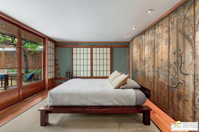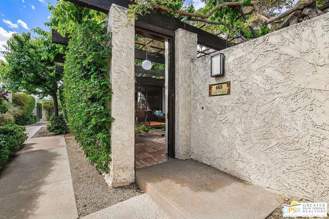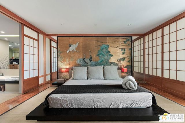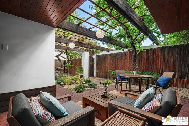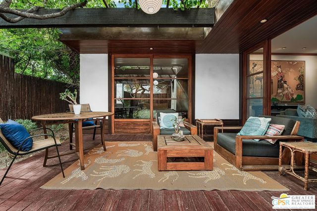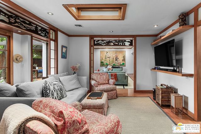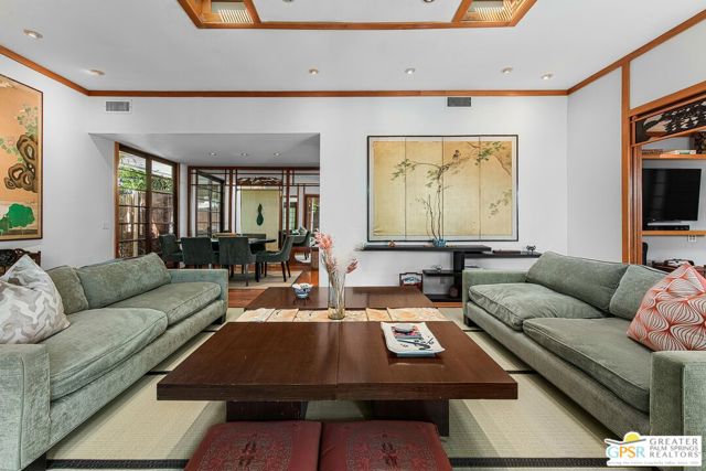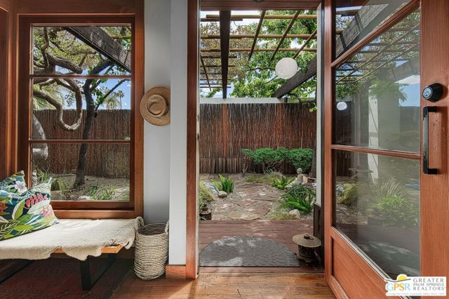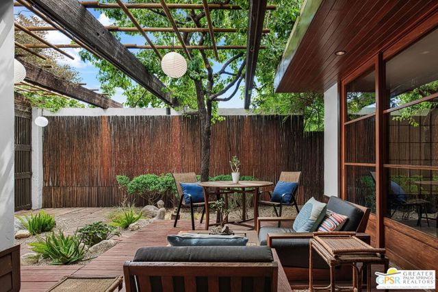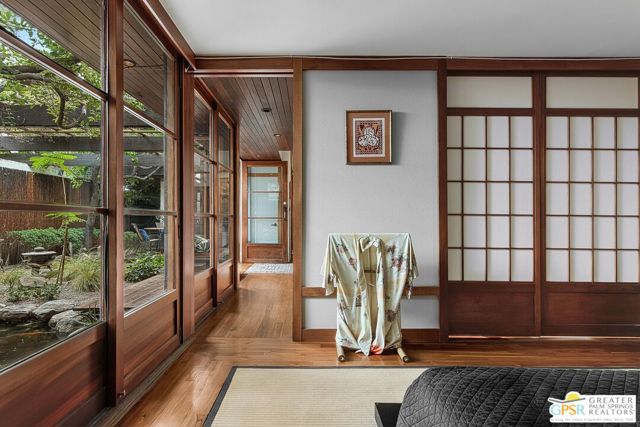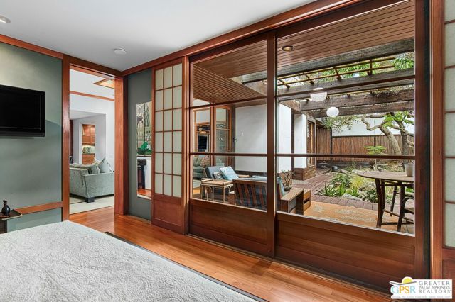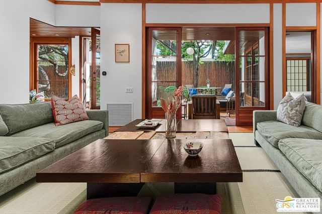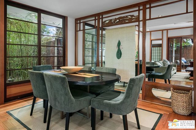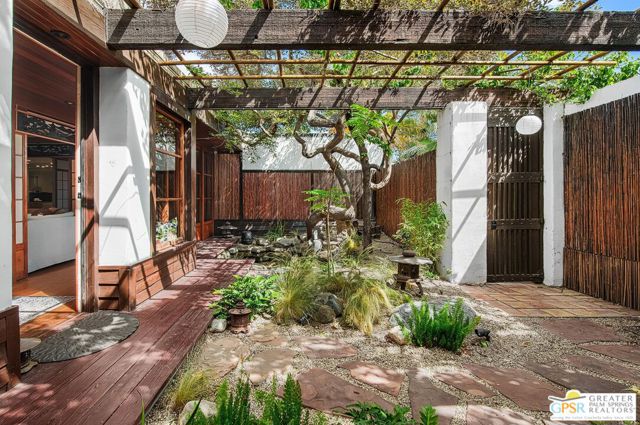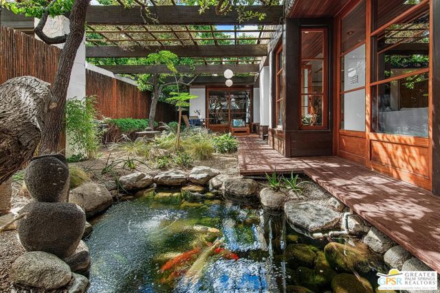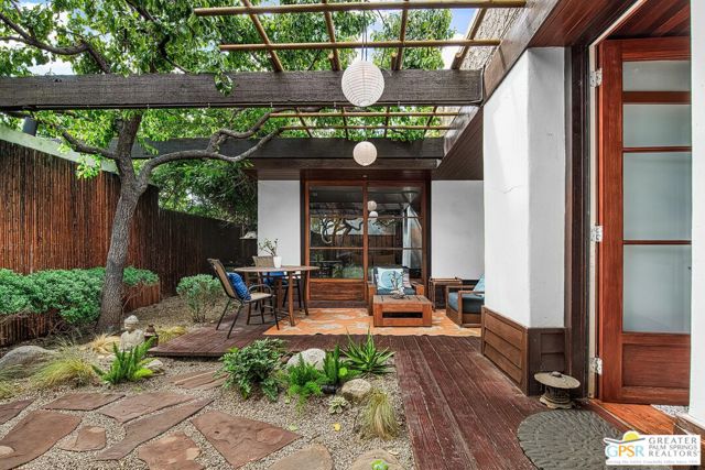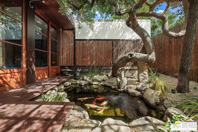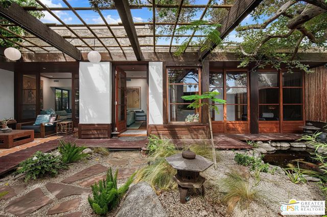 Set within the sought-after Greenhouse East community, this distinctive corner residence offers the largest floor plan in the development and blends Japanese-inspired architectural character with a calm, design-forward aesthetic. Offering approximately 1,650 sq ft, the layout includes 2 bedrooms, 3 bathrooms, and a versatile den that can easily function as a third bedroom or office. The defining feature is the private interior courtyard, an immersive Japanese garden with a mature koi pond, creating a tranquil focal point and seamless extension of the living space. Sliding Japanese shoji screens provide flexibility between an open primary suite and a separate guest or den area. Skylights throughout invite soft natural light, complementing warm teak hardwood floors and clean, understated finishes. Two en suite bedrooms and multiple living areas enhance both comfort and functionality. Greenhouse East is known for its expansive, beautifully landscaped grounds, along with amenities that include a junior Olympic-size pool, spa, and tennis court. Rare for the community, this home includes a private individual one-car garage. The property is on fee land (you own it). Located just minutes from downtown Palm Springs and near the Movie Colony neighborhood, this home offers a compelling blend of privacy, style, and convenience.