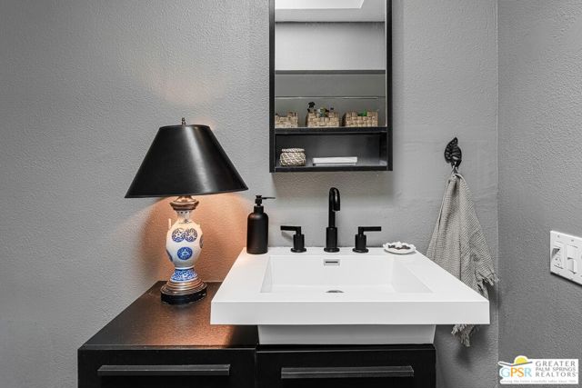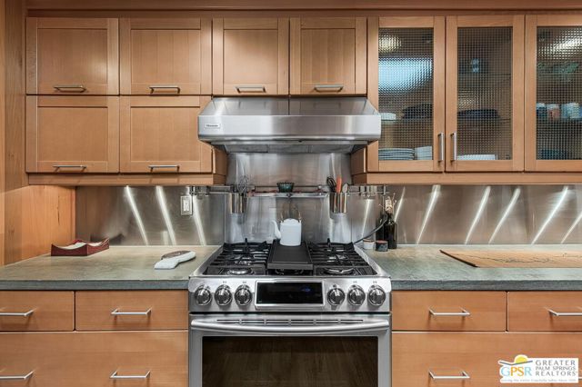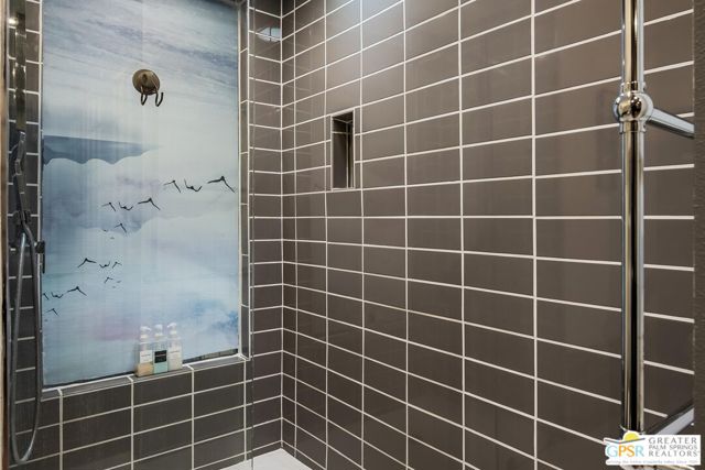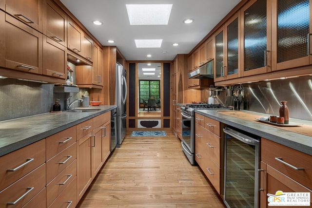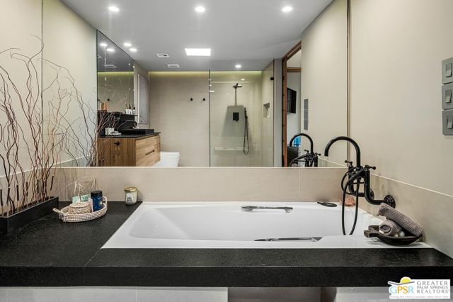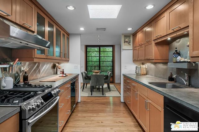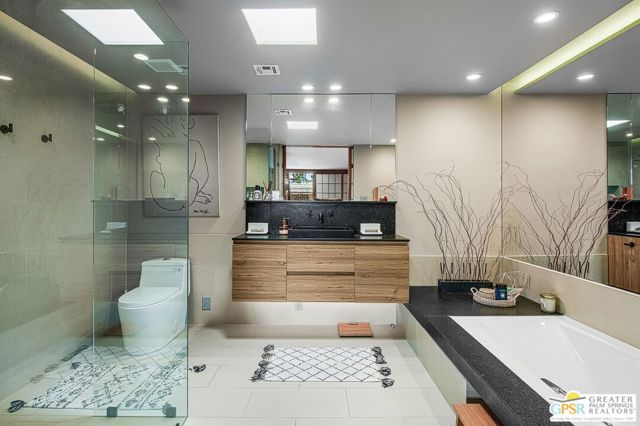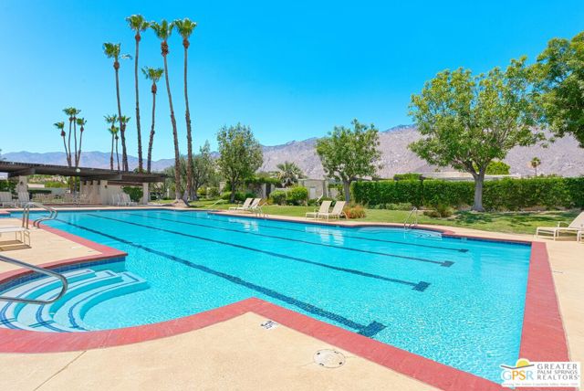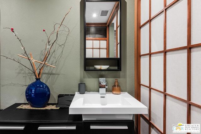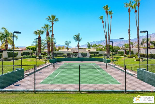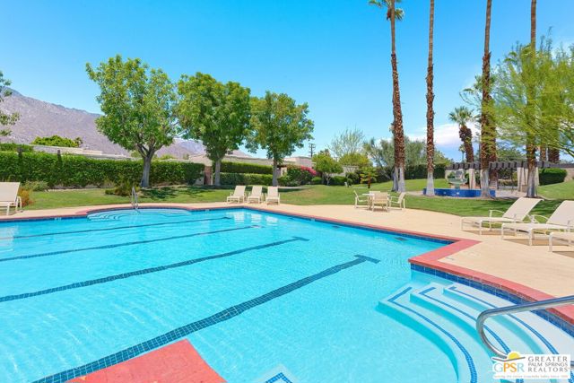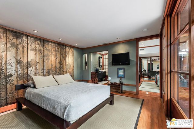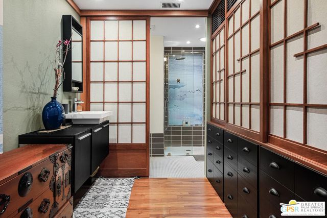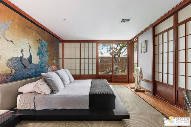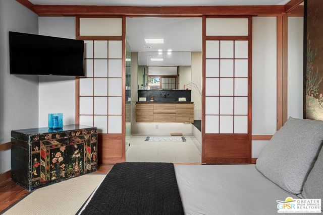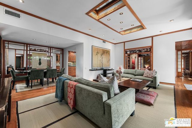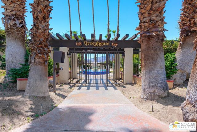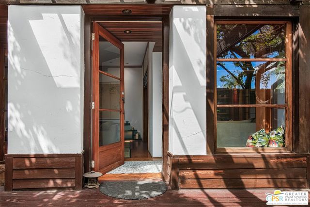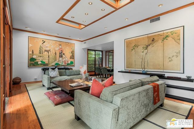 Set within the sought-after Greenhouse East community, this distinctive corner residence offers the largest floor plan in the development and blends Japanese-inspired architectural character with a calm, design-forward aesthetic. Offering approximately 1,650 sq ft, the layout includes 2 bedrooms, 3 bathrooms, and a versatile den that can easily function as a third bedroom or office. The defining feature is the private interior courtyard, an immersive Japanese garden with a mature koi pond, creating a tranquil focal point and seamless extension of the living space. Sliding Japanese shoji screens provide flexibility between an open primary suite and a separate guest or den area. Skylights throughout invite soft natural light, complementing warm teak hardwood floors and clean, understated finishes. Two en suite bedrooms and multiple living areas enhance both comfort and functionality. Greenhouse East is known for its expansive, beautifully landscaped grounds, along with amenities that include a junior Olympic-size pool, spa, and tennis court. Rare for the community, this home includes a private individual one-car garage. The property is on fee land (you own it). Located just minutes from downtown Palm Springs and near the Movie Colony neighborhood, this home offers a compelling blend of privacy, style, and convenience.