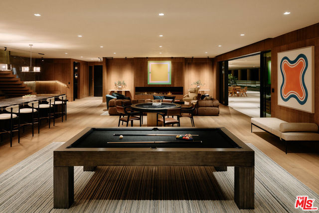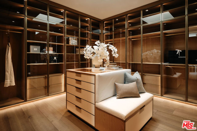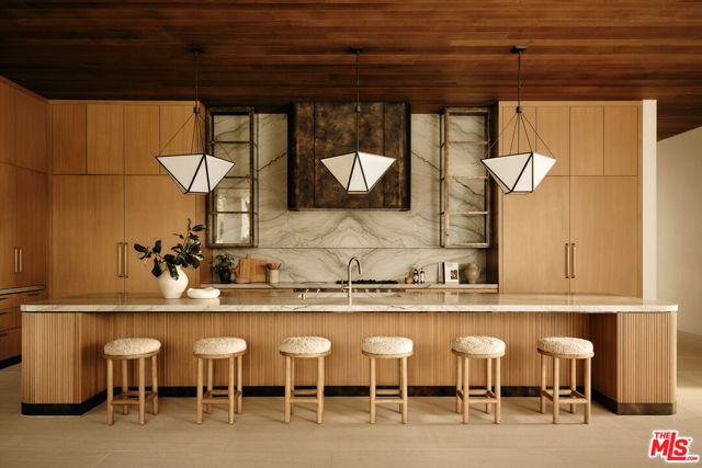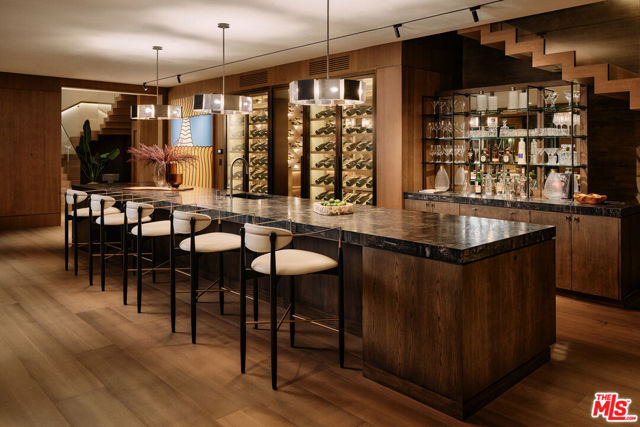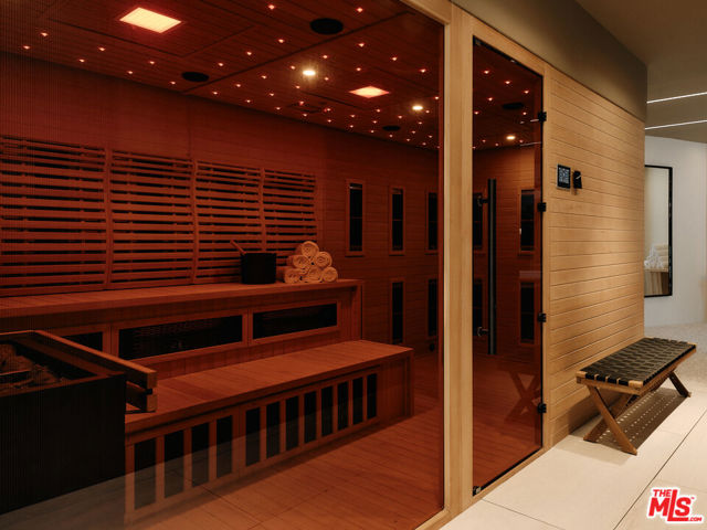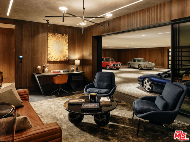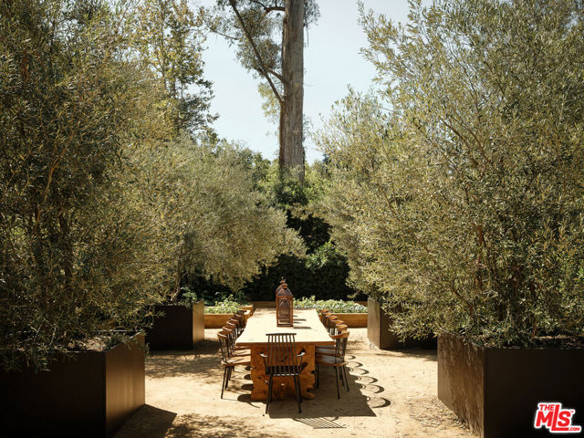 Serenity patiently awaits at Villa Serenique, a truly one-of-one estate designed with deep reverence for organic materials, refined amenities, and understated sophistication. Located at 401 N Tigertail Road, just minutes from Brentwood Village, the home offers seamless access to L.A.'s premier dining, shopping, and hiking trails. Crafted over four years and thoughtfully designed with Tiffany Harris Design, Villa Serenique spans approximately 20,000 square feet on over one acre, featuring nine bedrooms. The residence is wrapped inside and out in hand-chiseled Portuguese limestone, complemented by Roman plaster walls, travertine, and board-formed concrete creating a calm, timeless atmosphere rooted in nature. Beyond a gated entry, limestone steps lead to a grand double-height door opening into light-filled living and dining spaces divided by a limestone fireplace. Floor-to-ceiling glass frames hillside views and opens to expansive outdoor entertaining areas. The hosting level includes an open-air kitchen with gas and Argentinian-style grills, a pool and hot tub with sunken firepit seating, manicured lawns with citrus and olive trees, a private walnut-wrapped office, chef's kitchen with brass hood, industrial prep kitchen, two guest suites, laundry room, garage, and secured delivery cabinet. Upstairs, canyon and city views accompany three ensuite bedrooms, a lounge, and the primary retreat featuring a private balcony, silver travertine accents, dual spa-like bathrooms with heated floors, and custom walk-in closets.The lower level offers a world-class wellness and entertainment wing: an indoor-outdoor gym, Pilates studio, lap pool, cold plunge, infrared sauna, steam spa, car gallery with drive-in movie capability, and parking for 10 plus cars, soundproof theater, bar, wine cellar, and additional ensuite bedrooms. Below the home lies a private outdoor retreat with soccer field, a pickleball court, gardens, and an Italian-style dining terrace. Quiet yet central, Villa Serenique is a sanctuary that grounds, restores, and inspires an everyday retreat for mind, body, and spirit.