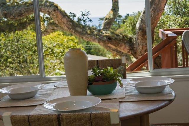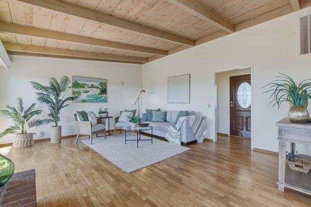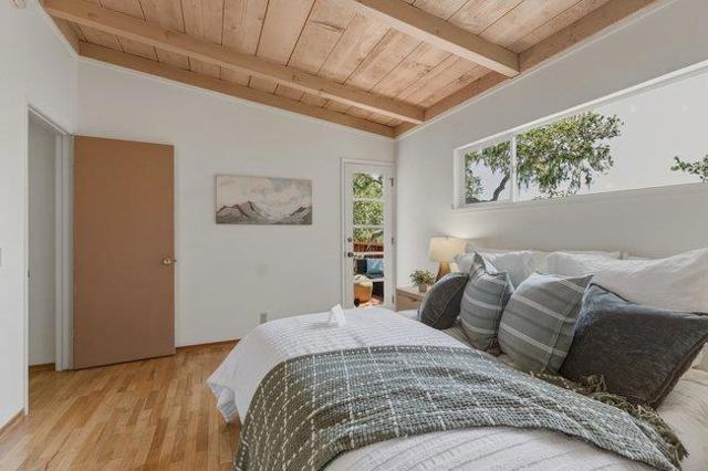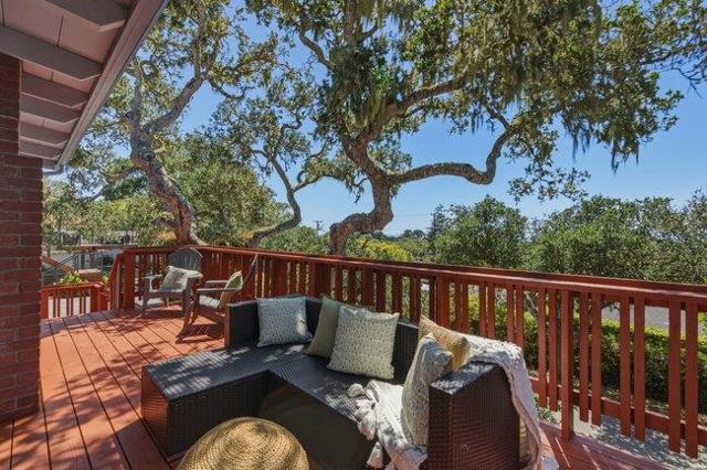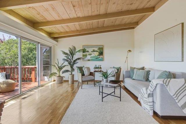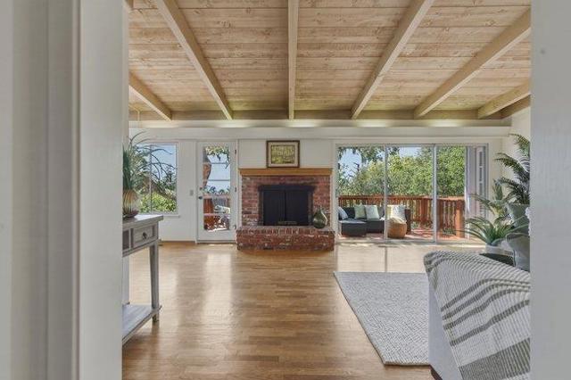 Perched to capture soft coastal light and glimpses of the Pacific, this comfortably designed three-bedroom, two-bath residence blends timeless mid-century style with effortless California living. A wall of windows invites natural light to pour in, creating a warm, airy ambiance while framing select ocean views that shift with the day. Warm classic hardwood floors run throughout the home, complementing the clean architectural lines and enhancing its understated elegance. The thoughtfully designed layout offers both an inviting atmosphere and versatility ideal as a serene vacation retreat or a refined full-time residence. Set on a generous lot, the property provides space, privacy, and privacy all anchored by a serene outdoor escape perfect for morning coffee or evening gatherings beneath mature oak trees. The seamless indoor-outdoor connection invites you to relax, entertain, and fully embrace the coastal lifestyle. Complete with a spacious two-car garage and designed for easy care living, this home blends style with everyday living and is ready to welcome its next chapter.