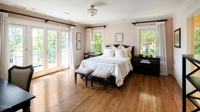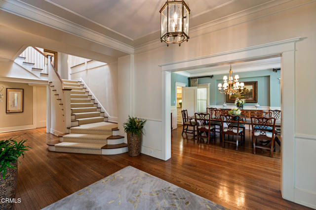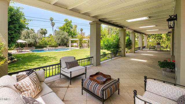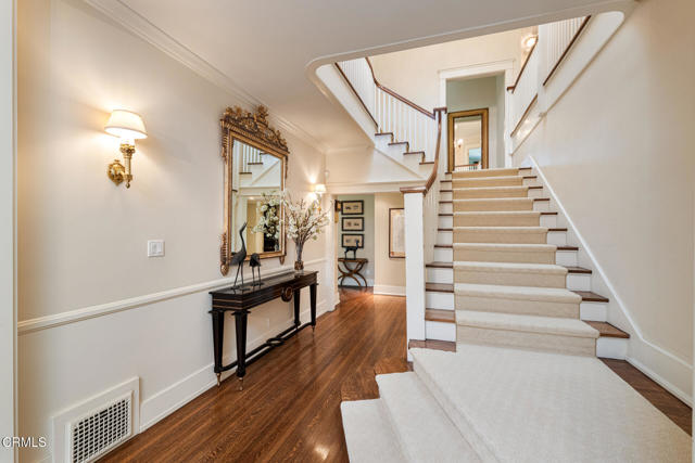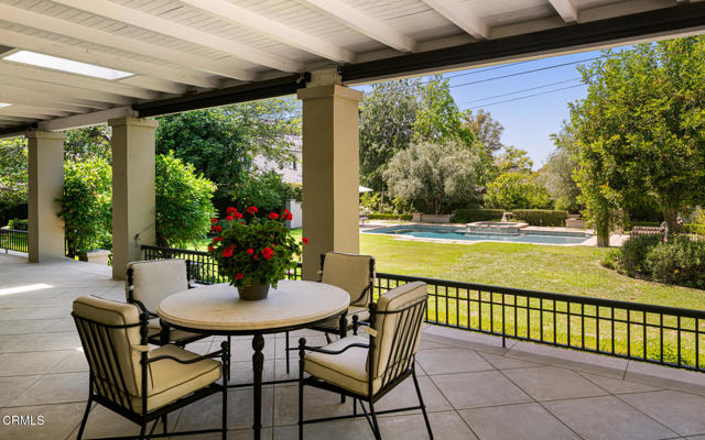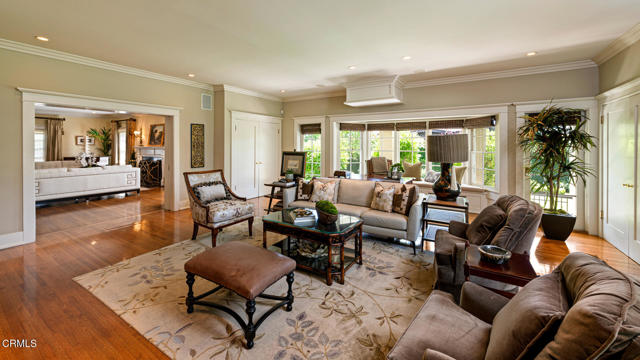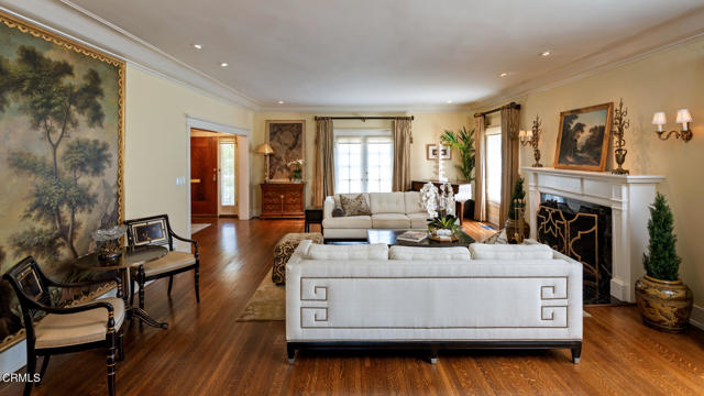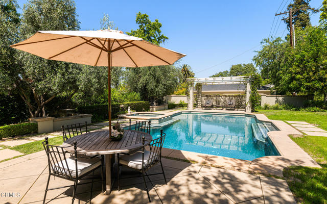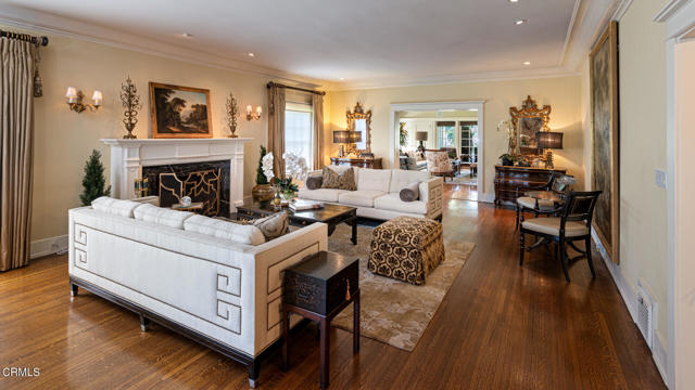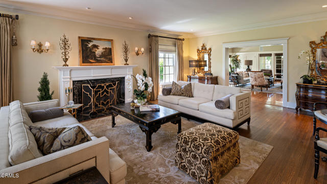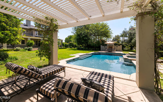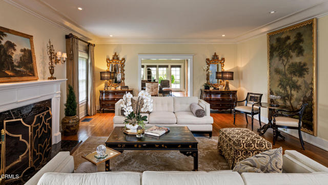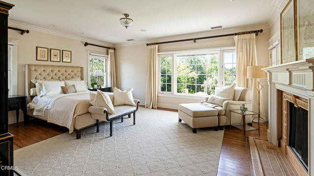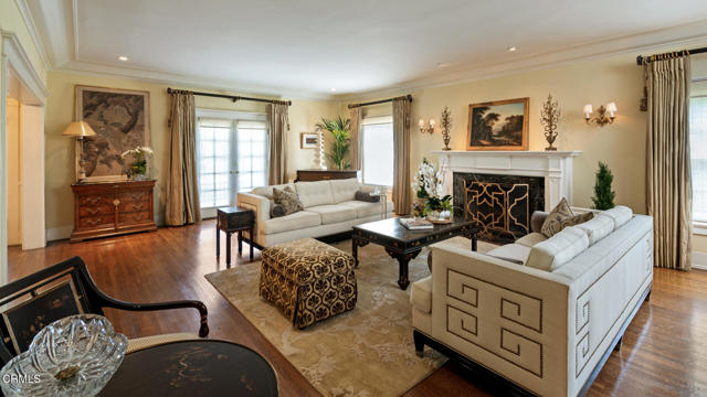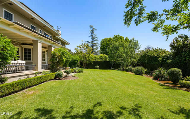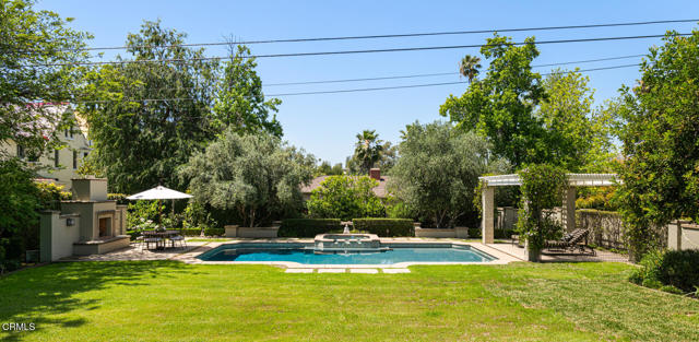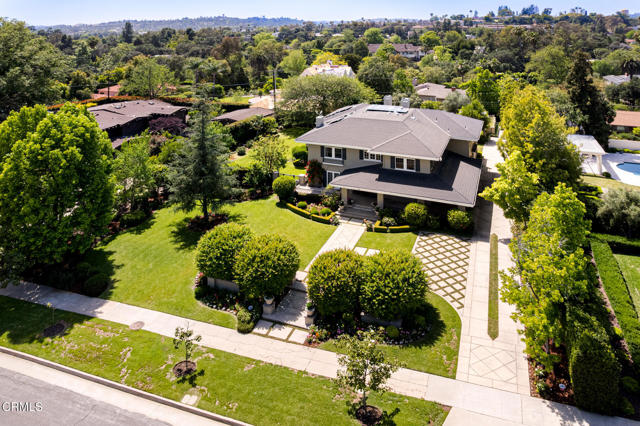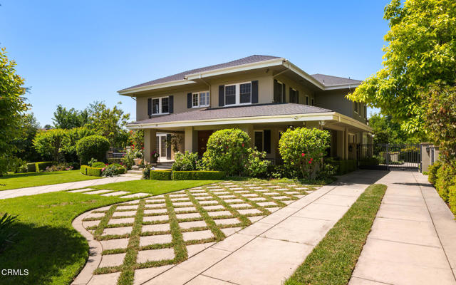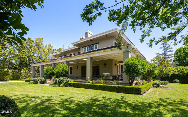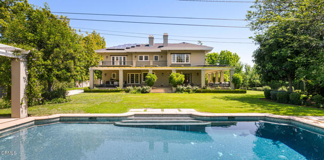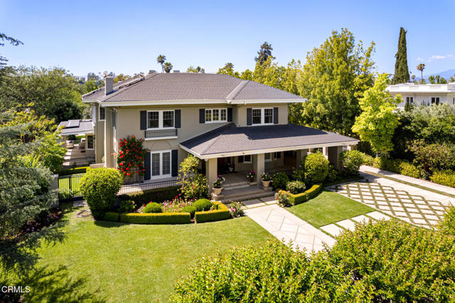 Situated on one of the most prestigious and coveted streets in Pasadena, this classic 1916 two-story estate blends timeless elegance with understated luxury and refined comfort. Set on a sprawling 32,794-square-foot lot, the residence is enveloped by lush greenery and mature landscaping, offering a serene sanctuary that perfectly balances grand scale with an intimate, harmonious atmosphere.An inviting foyer opens to the elegant living room, which is anchored by a magnificent statement fireplace. The graceful formal dining room, designed for sophisticated entertaining, is complemented by a professional butler's pantry. The beautifully appointed chef's kitchen features a substantial center island, high-end built-in appliances, abundant cabinetry, and a walk-in pantry. A charming breakfast nook flows seamlessly into the family room, complete with a built-in entertainment center and a picturesque bay window featuring a seated storage bench. French doors lead to a wrap-around patio, creating a seamless transition to the backyard for a true indoor-outdoor lifestyle. The main level is completed by a versatile den/office and a guest powder room.On the upper level, four en-suite bedrooms, an office, and a laundry room are centered around a landing illuminated by a stunning leaded-glass skylight. The primary suite is a true retreat, featuring a romantic fireplace, dual custom walk-in closets, and a spa-like primary bath with a steam shower, marble-topped dual sinks, and a jetted soaking tub. Private doors open to a secluded balcony overlooking the tranquil grounds. Three additional spacious en-suite bedrooms, each with updated baths and walk-in closets, provide comfort and privacy for family and guests alike.The exterior is an entertainer's dream, boasting expansive grounds with flowering gardens, a greenery trellis, and a sparkling pool and spa. Multiple seating areas, a fountain, and an outdoor fireplace offer an ideal setting for large-scale gatherings or quiet evenings under the stars. Additional features include hardwood floors, custom drapes and window coverings, a 4-zone HVAC system, a security alarm and video surveillance system, Sonos sound, and a gated driveway leading to a 3-car garage with EV charging and a fully paid-off solar system.Just moments from Old Town Pasadena and the South Lake Avenue District, this estate offers a rare opportunity to experience sophisticated living at its very best.