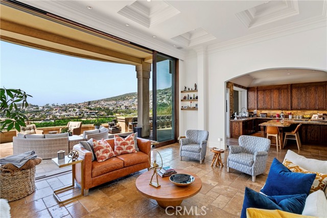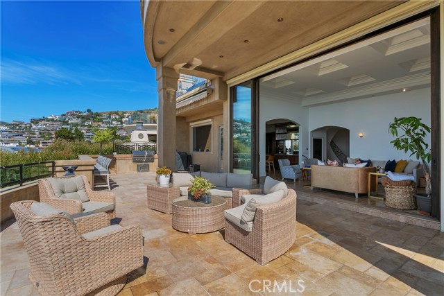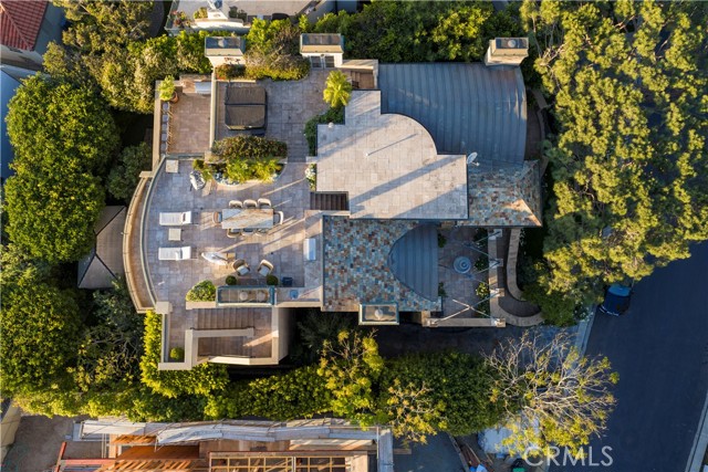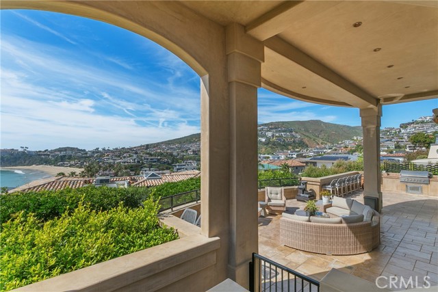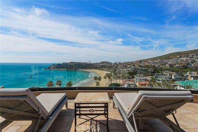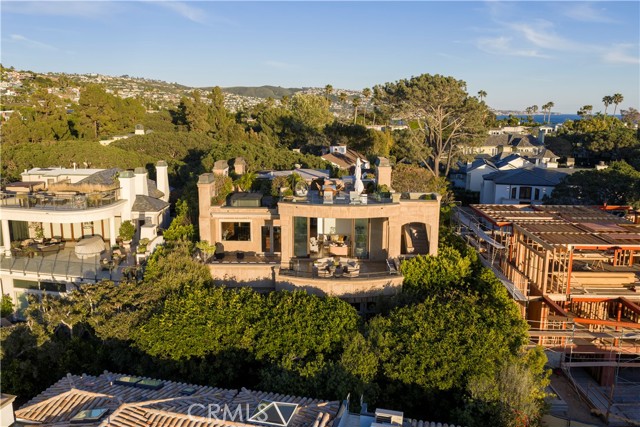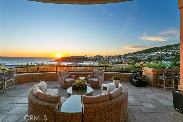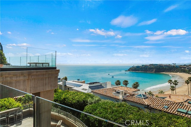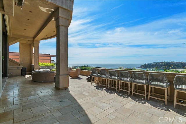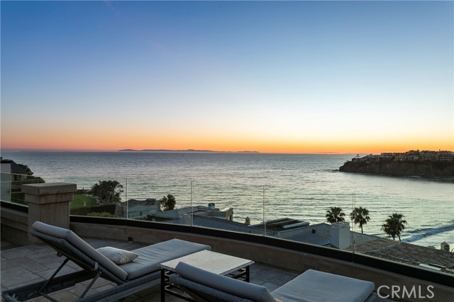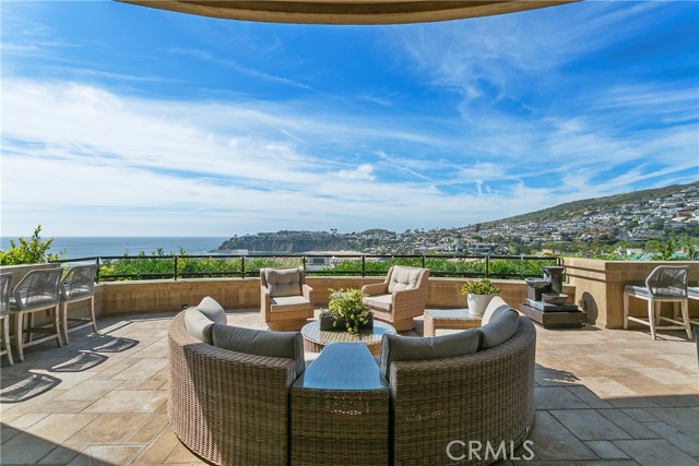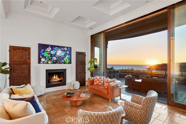 A residence of this caliber is rarely available. Set above one of Laguna Beach’s most dramatic stretches of coastline, this custom estate offers sweeping views of the Pacific, Catalina Island, and the rugged shoreline. Surrounded by the historic Smithcliffs pine trees, the property provides privacy and a unique sense of place. The architecture blends classic and modern influences, with interiors designed to connect seamlessly to terraces, gardens, and sun-filled outdoor spaces. The main level supports both entertaining and everyday living, beginning with a striking foyer and floating spiral staircase. The great room opens through large sliding doors to the main ocean-facing terrace. The kitchen features custom wood cabinetry, an oversized island, walk-in pantry, and professional-grade appliances from Wolf, Fisher & Paykel, Sub-Zero, and Miele. A formal dining room with a cross-vaulted ceiling opens to the outdoors through newer Fleetwood French doors. Approximately 7,119 square feet, the home includes four ensuite bedrooms and nine baths. The privately positioned primary suite opens to a meditation garden and includes two walk-in closets and a jetted tub. Additional features include handcrafted finishes, custom mosaics, wood and stone flooring, three fireplaces, multiple wet bars, a temperature-controlled wine cellar, upgraded AV system, newer generator, and an elevator. The lower level showcases an exceptional 11-car garage—an uncommon amenity in coastal Laguna Beach—ideal for collectors or those seeking a display gallery or workshop. The rooftop deck offers a private retreat with a fireplace, newer glass surrounds, above-ground spa, built-in BBQ, and dining area framed by expansive ocean views. This property represents a rare opportunity to own a home of significant scale, craftsmanship, and coastal presence in one of Laguna Beach’s most distinctive neighborhoods.