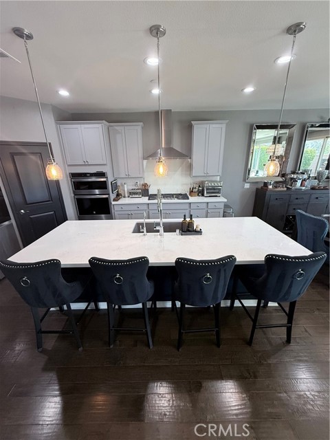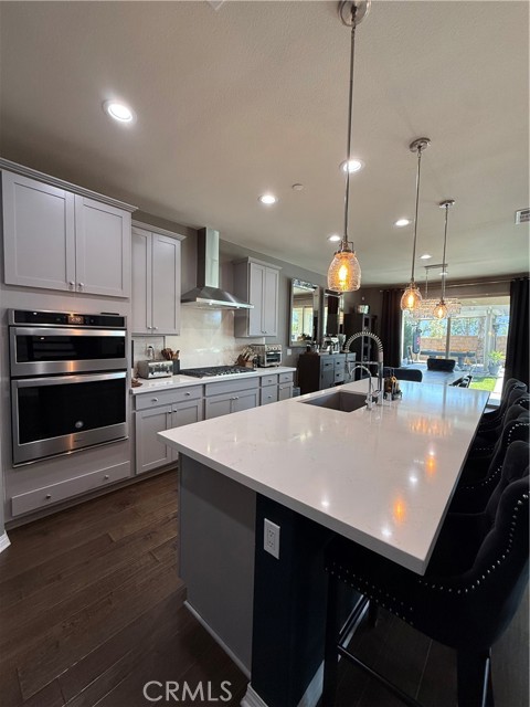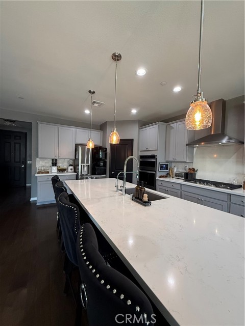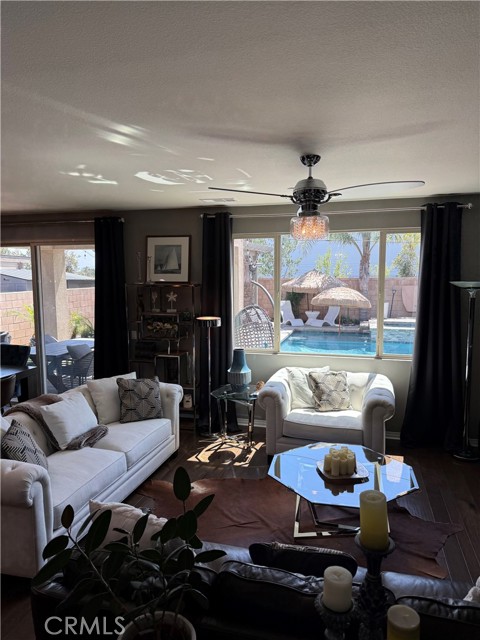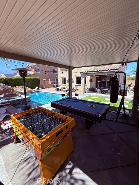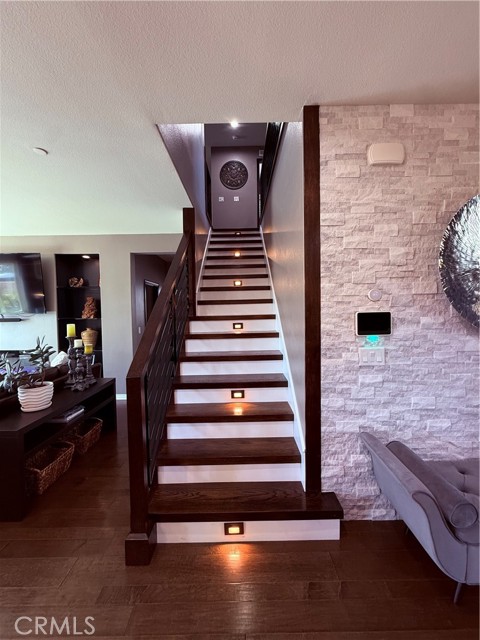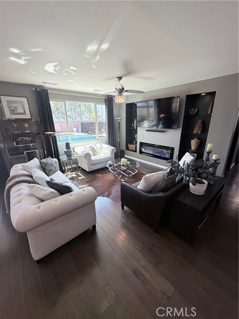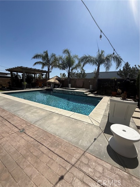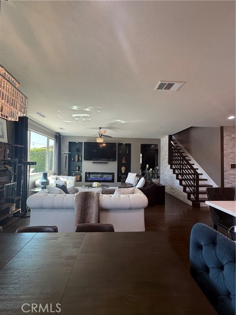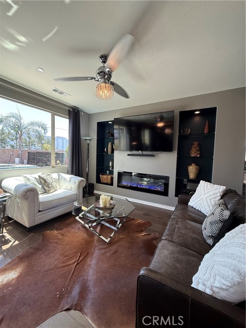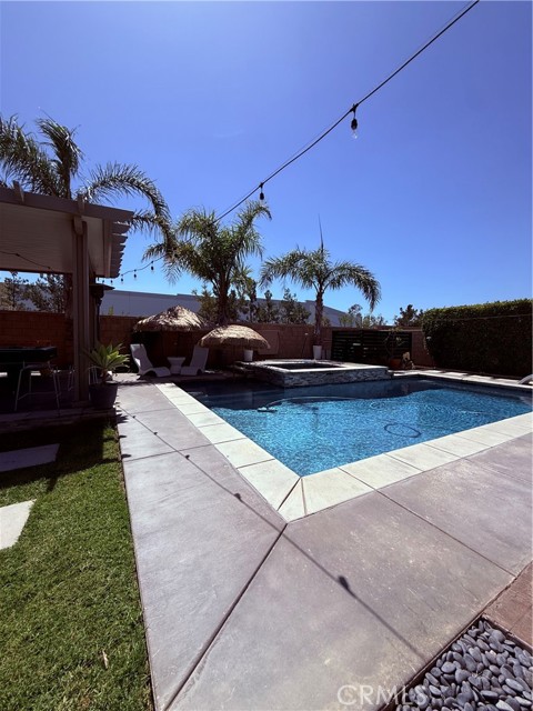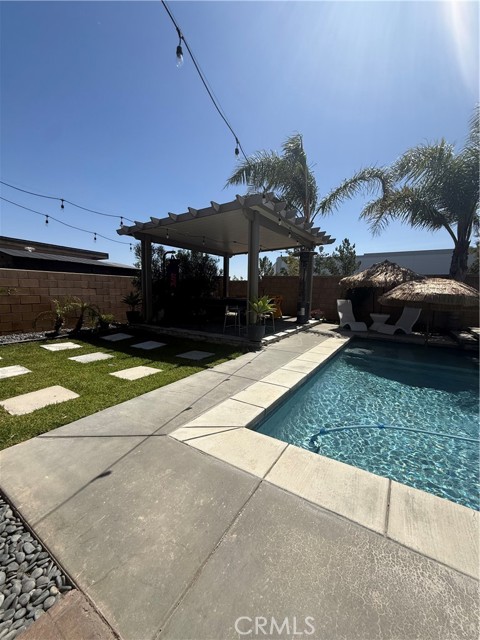 Embraced by tranquil mountain views, this stunning five-bedroom, three-bath home offers the perfect blend of comfort and style. From the moment you walk in, custom stairs, striking lighting, and rich hardwood flooring create an inviting feel throughout. A beautiful custom TV niche with a heater insert adds warmth and charm, making the living space perfect for cozy evenings at home. The chef-inspired kitchen is designed to impress, featuring abundant quartz counter space, a grand island, and beautiful cabinetry that make it ideal for cooking, entertaining, and gathering with family and friends. Upstairs, the spacious loft offers endless possibilities as a gym, theater room, or bonus living area. The primary suite offers a relaxing retreat with a walk-in closet and a luxurious Jacuzzi tub. Additional highlights include a two-car garage with an electric car charger, a water softener system, solar panels, and plenty of storage space throughout the home.Step outside to your own private retreat with a heated pool, beach entry, two covered patios, stamped brick concrete, and a bike trail behind the property. Conveniently located near shopping, freeways, and Victoria Gardens, this home truly offers a lifestyle of comfort, beauty, and convenience. All buyers, agents, brokers MUST verify all information for accuracy and are strongly advised to complete ALL due diligence. Elevate Real Estate Agency makes no representations or warranties, express or implied. This information is not a substitute for inspections provided by licensed professionals. Pease note, the MLS information is provided for advertising purposes only and is deemed reliable but not guaranteed.