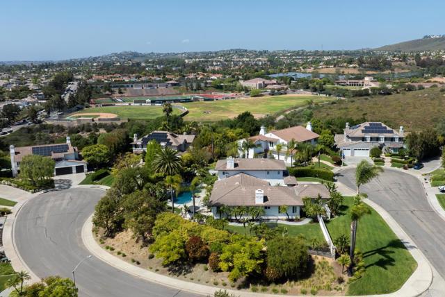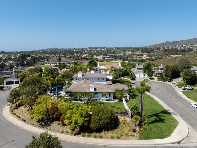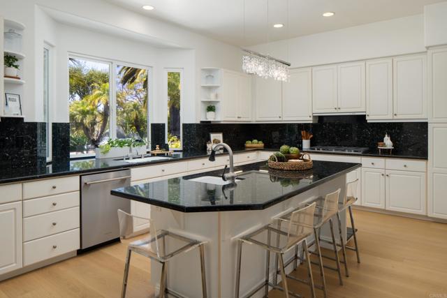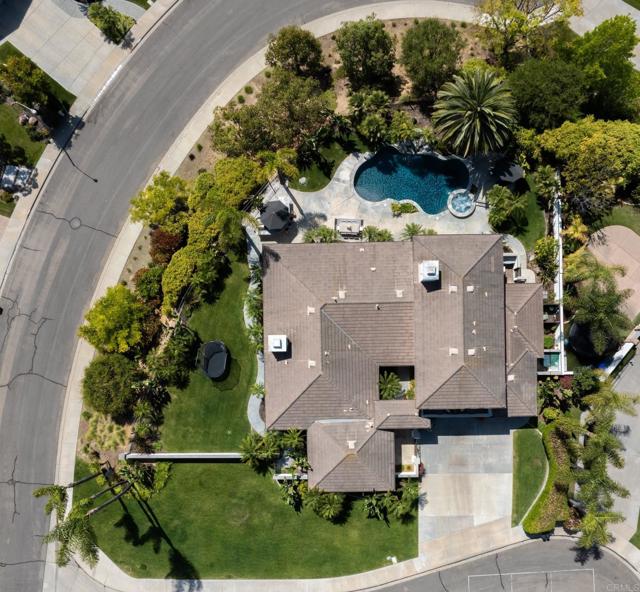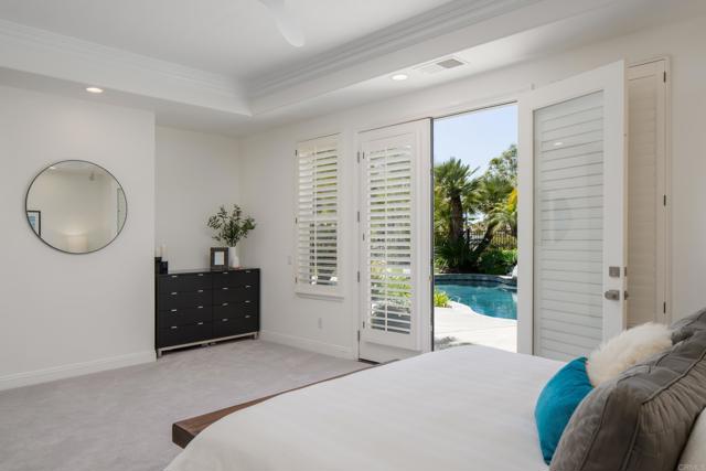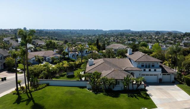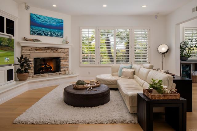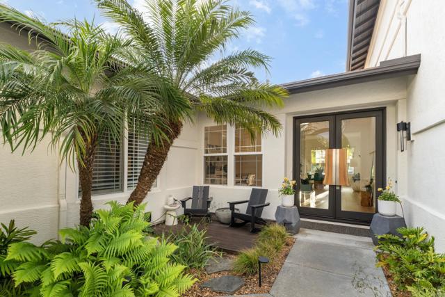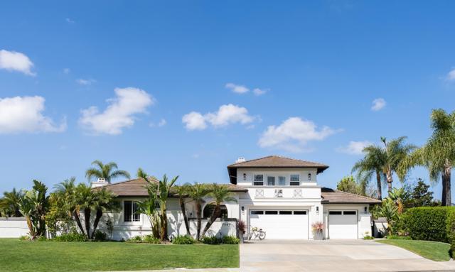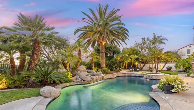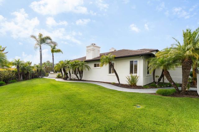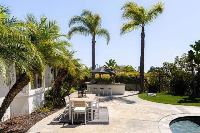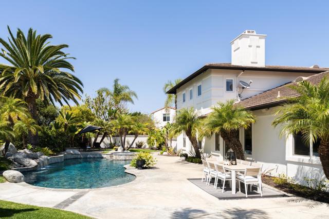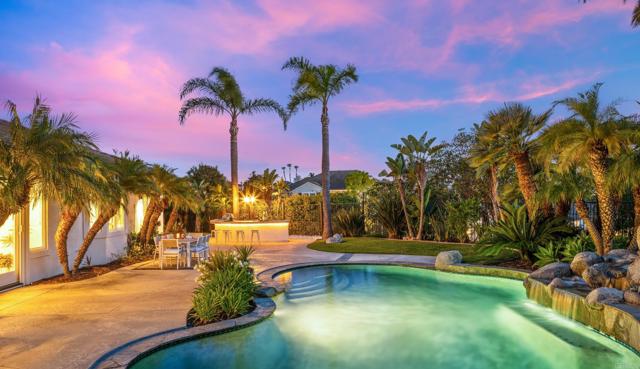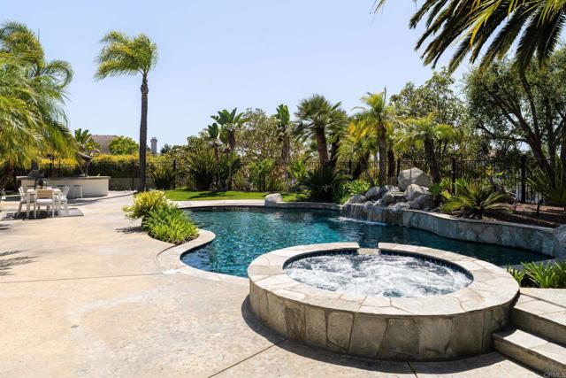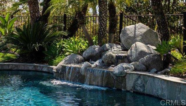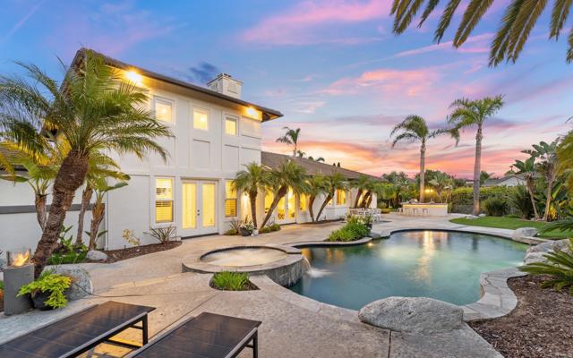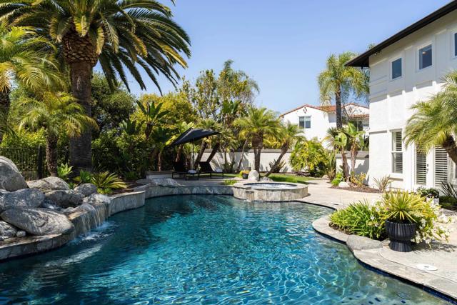 RARELY does a property come to market that TRULY HAS IT ALL: a great neighborhood, large private parcel, gorgeous grounds, west-facing backyard & a flexible floorplan. Located on a quiet cul-de-sac in THE RANCH, an enclave between Olivenhain & La Costa, this exceptional estate offers PRIVACY, scale & COASTAL ELEGANCE. Set on the “developer’s own” PRIME .61 ACRE LOT, it feels like an elevated tropical island with ONLY ONE adjacent neighbor. A private courtyard leads to custom glass entry doors with HANDCRAFTED WALNUT live-edge handles. Inside, nearly 5,000 sq ft of thoughtfully designed space offers STYLE & FLEXIBILITY. The formal living room, currently styled as a spacious dining area, features a WALL OF WINDOWS framing a CASCADING WATERFALL, POOL & PALMS. The formal dining room has been thoughtfully repurposed as a stylish family office. At the HEART OF THE HOME, the inviting family room centers around a STONE FIREPLACE with expansive windows. The ISLAND KITCHEN opens to a breakfast area with French doors to the backyard. A large RECREATION ROOM serves as the ACTIVITY HUB, with space for a pool table, gym, lounge & putting practice. LIVES LIKE A SINGLE STORY with a primary suite & 2 additional bedrooms on the main level. While upstairs there are 2 more bedrooms & a living room with deck, ideal for guests, office, bonus space or MULTIGENERATIONAL LIVING. The primary retreat features French doors to the yard, a SPA-LIKE bath & custom dream closet. The backyard is a PRIVATE RESORT with a dramatic waterfall, freeform pool & spa, outdoor kitchen & lush tropical landscaping and a custom designed outdoor shower. Located in the highly regarded Encinitas School District and just minutes from beaches, shopping, and dining.