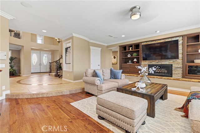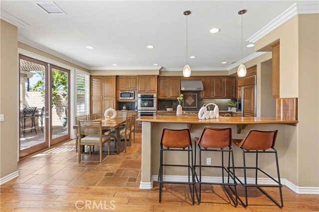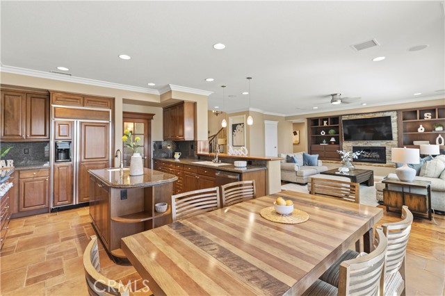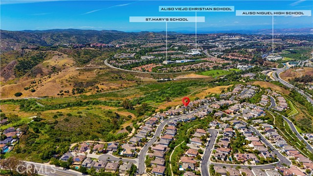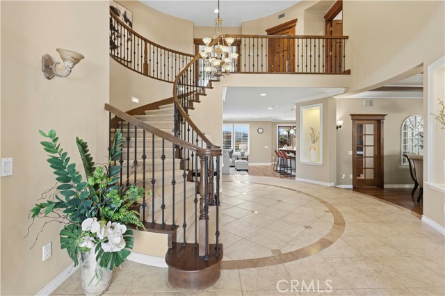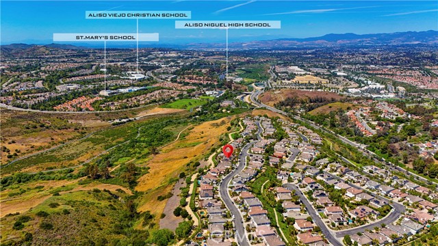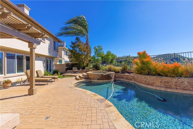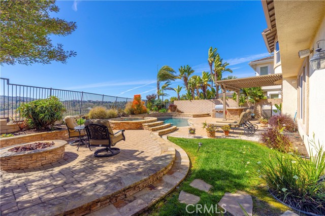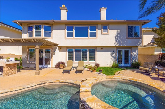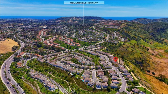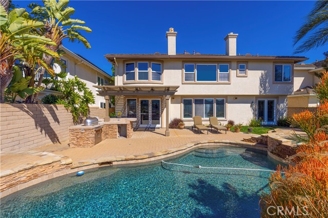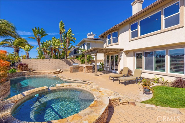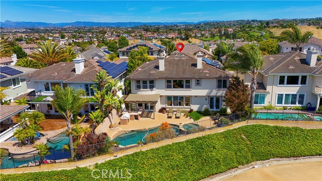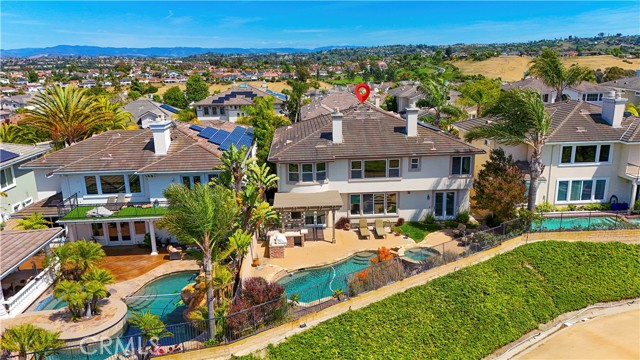 Tucked away in one of the most coveted locations within Hillcrest Estates, 28821 Drakes Bay offers a rare combination of privacy, luxury, and breathtaking natural beauty—backing directly to Aliso Creek/Wood Canyon with no rear neighbors and unobstructed sit-down canyon views from both levels. This expansive residence showcases the largest floor plan in the community, enhanced with a builder-option 5th bedroom and a thoughtfully designed custom bonus room—ideal for a home office, media space, gym or playroom. A grand foyer welcomes you with soaring ceilings and a striking circular staircase, setting the tone for the home’s elegant interior. Thoughtful upgrades throughout include custom craftsman doors, crown molding, designer baseboards, central vacuum, and integrated sound wiring. The gourmet kitchen is designed for both everyday living and entertaining, featuring dual sinks, a center prep island, and a distinctive wood breakfast bar, all opening to a light-filled breakfast nook with French doors that frame the stunning canyon backdrop. The adjacent family room offers warmth and sophistication with a stone fireplace and custom built-ins. A highly desirable main-level en-suite bedroom provides flexibility for guests or multi-generational living. Upstairs, the expansive primary suite serves as a private retreat, complete with a dual-sided fireplace, sitting area, and sweeping canyon views. The spa-inspired primary bath includes dual vanities, a soaking tub, separate shower, and an oversized walk-in closet. Additional upstairs bedrooms include a versatile expanded bonus/playroom. Step outside to a resort-style backyard designed for unforgettable entertaining—featuring a saltwater PebbleTec pool and spa, cascading waterfalls, built-in BBQ island with bar seating, fire pit, and beautifully curated landscaping—all set against panoramic sunset views. Additional highlights include repiping and numerous custom upgrades throughout. Solar panels are all paid off! This is a rare opportunity to own a premier view property in one of Laguna Niguel’s most desirable communities.
