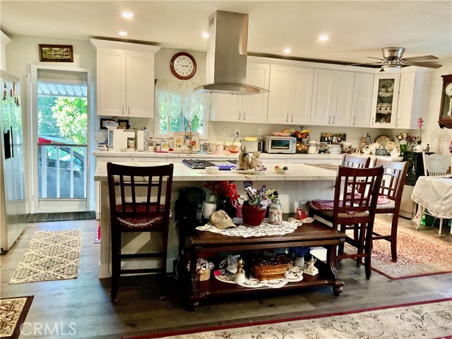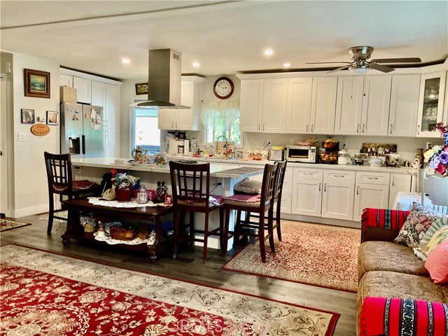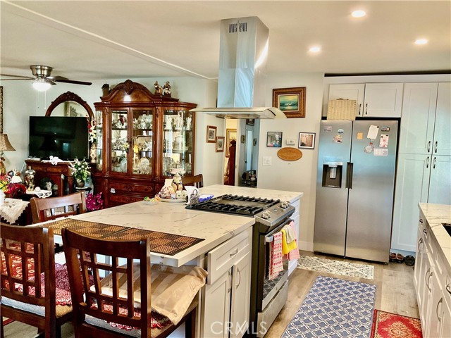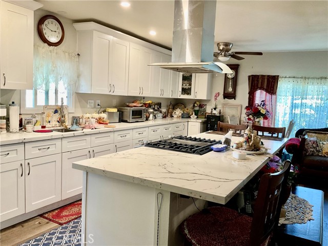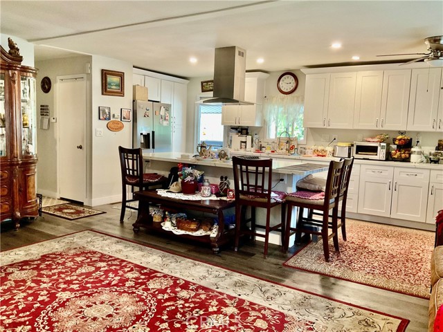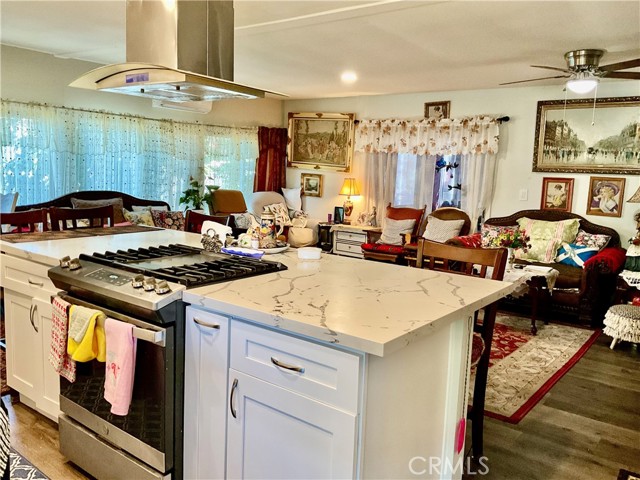 Remodeled and upgraded double-wide 2-bed/2-bath home located in Valley View Mobile Home Park, a Senior community (55+) in Yucaipa. Home is well-maintained and includes an open floor plan, newer laminate flooring throughout, double pane window, ceiling fans & remodeled kitchen with a beautiful built-in island. The kitchen opens directly into the living room and includes a 6-burner gas range, custom quartz countertops & backsplash, a huge center island with breakfast bar, lots of cabinet space and stainless steel appliances. Nice Master bedroom size with mirrored closet doors and ceiling fan & remodeled master bathroom. The guest bath has been upgraded and features a shower tub, newer cabinets and fixtures. The home's exterior includes enclosed Patio & porch with a private spa, lots of storage space, fruit trees, two sheds & sprinkler system. Mountain View’s on this corner lot home that offers privacy and a quiet neighborhood in a well-kept park with community clubhouse pool close to everything in Yucaipa.