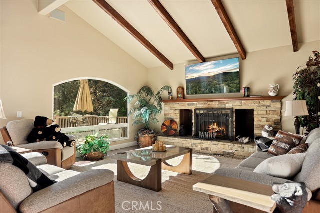 Welcome to this beautiful golf course frontage home, perfectly positioned at the end of a quiet cul-de-sac on the 15th Fairway. This sought-after Thunderbird floorplan offers an inviting open-concept design with vaulted, beamed ceilings and expansive windows that frame serene treed views and flood the home with natural light. Easy access with just a few steps to the main level, featuring the spacious living room with a stunning fireplace, an open dining...